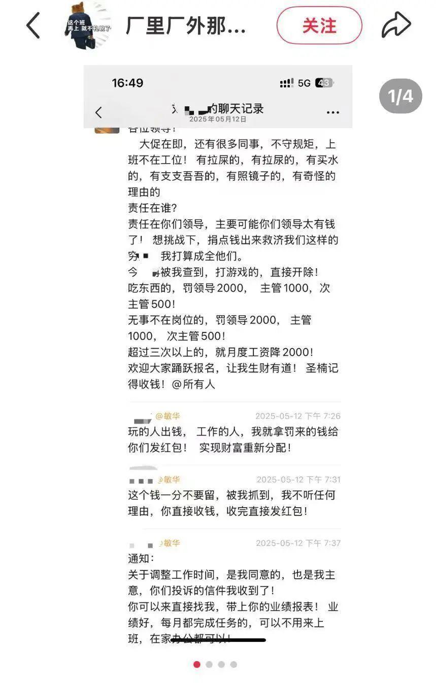 该用户公布的聊天截图显示,今年5月,该刘姓高管在工作群里发文称,有同事“上班不在工位”,有上厕所的,有“照镜子的、有奇怪理由的”,称“被我查到打游戏的,直接开除!吃东西的,罚领导2000,主管1000,次主管500”,“无事不在岗位的,超过三次以上的月度工资降2000”。此外,刘某被披露追加罚款内容称“下班不关电脑罚100”。